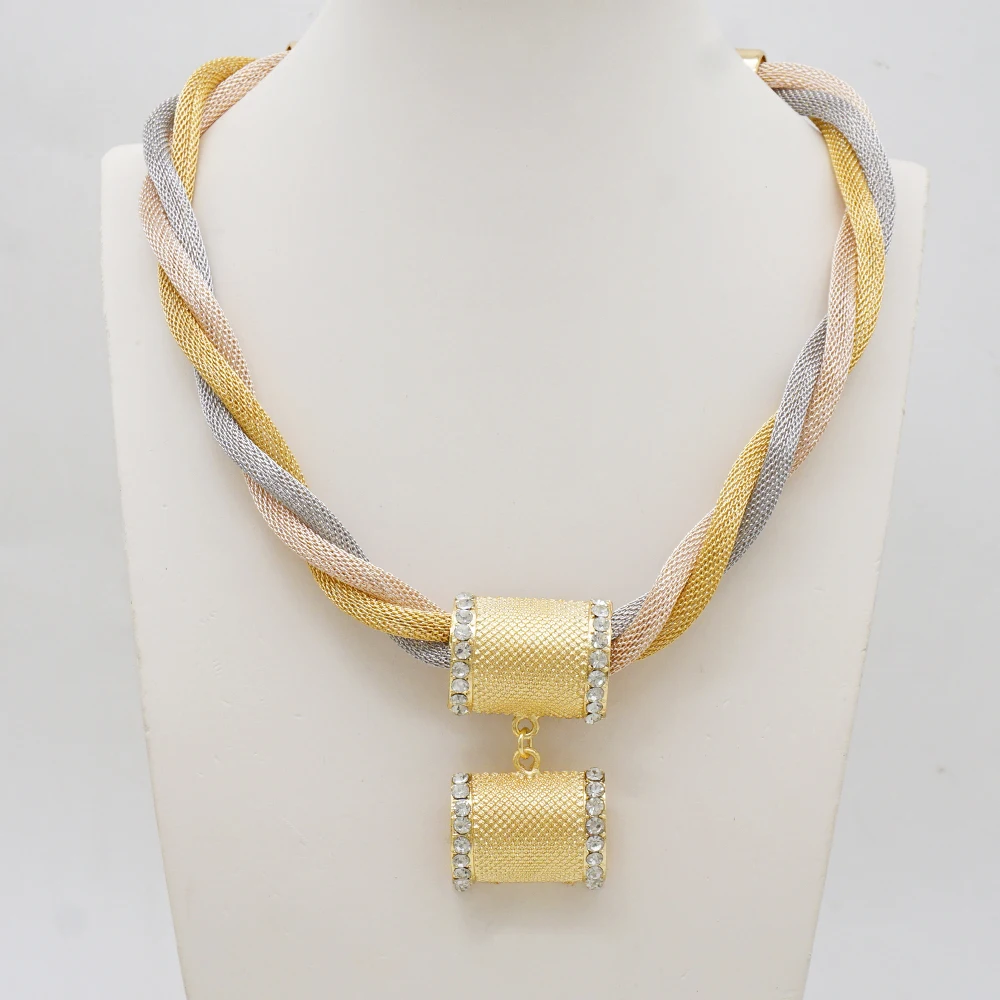 Gold plated crystal pendant necklace set, double chain jewelry set