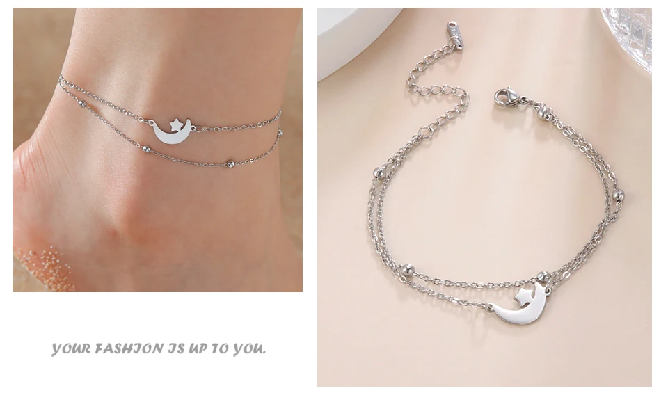 Teamer Exquisite Stainless Steel Anklet for Women Double Layer Airplane Lighting Moon Star Elephant Pendant Summer Accessories